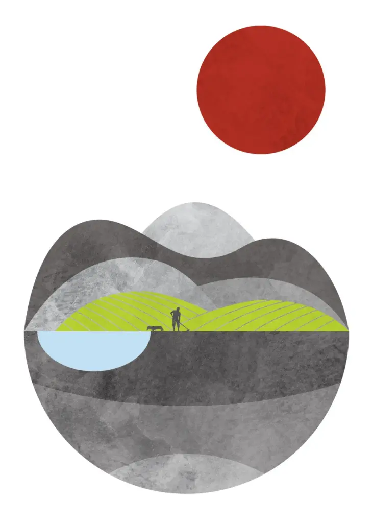 Showcases the importance of all the aspects of terroir while minimizing the role of man with a very small person holding a hoe (evidence of our manual labour non systematic or conventional work) + a dog drinking water from the lake/pond: testament to clean and holistic farming so the run off of water in the pond/lake is clean and entirely free of pesticide and herbicides.